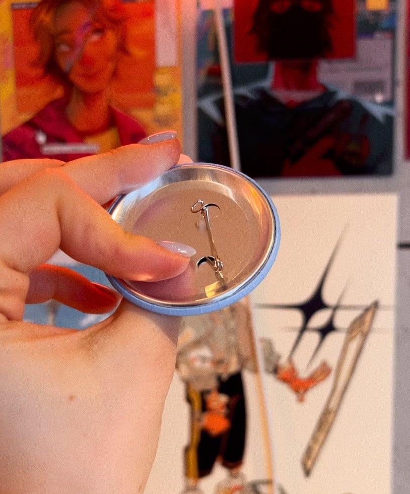 Matte front. Badge has a safety pin on the back.